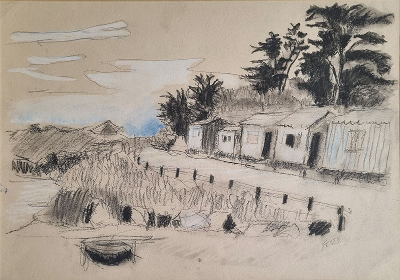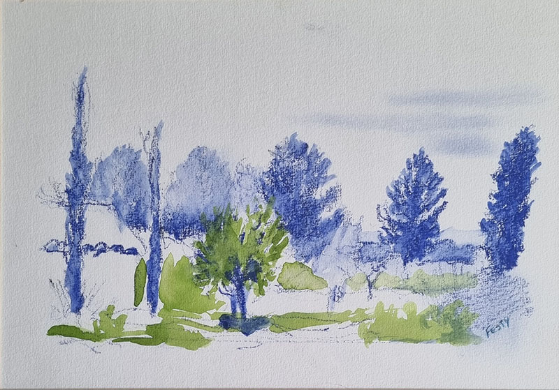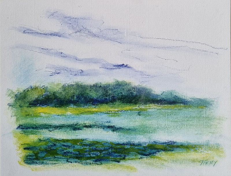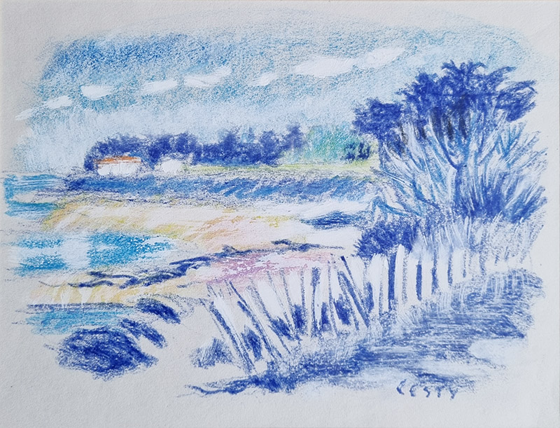 Dans ses pastels, le soleil joue à travers l’air humide, le brouillard est en suspension, la lumière nait d’un habile jeu d’ombres et de contrastes.